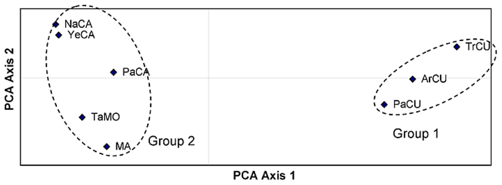 Pair-wise Nei’s distances [25] were calculated for all the populations. The highest inter-population average distance (0.283) was between PaCU and YeCA, while the lowest distance (0.031) was between TaMO and MA populations (Table 3).
