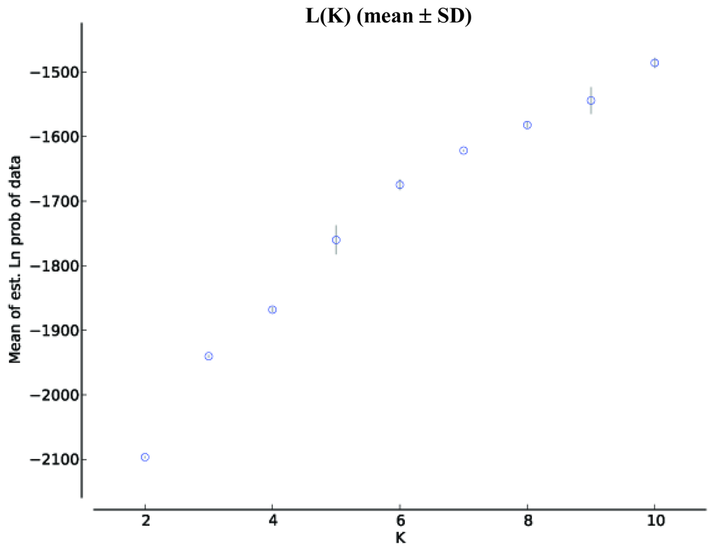 The population structure of P. nigra inferred using the method of Pritchard et al. [31], was carried out by STRUCTURE (version 2.3; University of Chicago: Chicago, IL, USA, 2004). The plot of the average log likelihood values over 10 runs for K values ranging from 2 to 10 shows that the log likelihood estimates increase progressively as K increases (Figure 2). The optimal value of K was 3 as determined by the ΔK statistic STRUCTURE (Figure 3). We calculated the proportions of membership (q1 for cluster 1, q2 for cluster 2, and q3 for cluster 3, with q1 + q2 + q3 = 1) of each region Cazorla, Cuenca, Sierra Mágina and Morocco. The populations from Cazorla, Morocco and Sierra Mágina were assigned to cluster 3, with a high percentage membership q3 = 0.85 for Cazorla, q3 = 0.89 for Morocco and q3 = 0.93 for Sierra Mágina which corresponds to Group 2 in the PCA analysis; all the populations from Cuenca region were assigned to cluster 1 and 2 with percentage membership of q1 = 0.35 and q2 = 0.54.