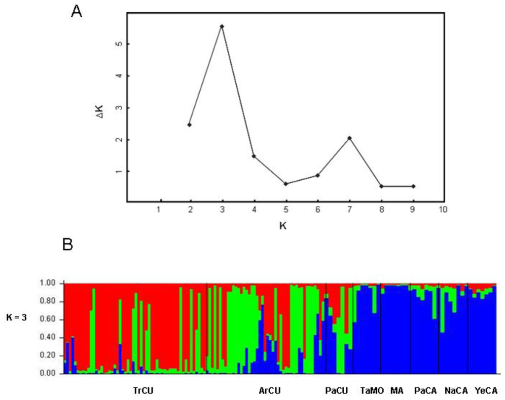 Bayesian assignment tests were applied to estimate the number of genetic clusters and to evaluate the degree of admixture among them using Structure v2.3.3 [42]. Structure was run with a “burn-in” setting of 100,000 followed by 20,000 MCMC iterations using the admixture model with sampling localities as prior population assignment and with allelic frequencies correlated among populations. Ten runs were performed for each value for K ranging from 2 to 10. The most likely value for K was calculated with Structure Harvester [43] using the statistic ΔK, which represents the greatest rate of change between each subsequent K value [44].