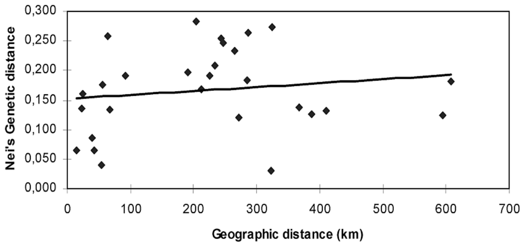 Relationship between genetic and geographic distances among the populations of Pinus nigra included in this study. The line is the regression fitted to the data. X-axis geographic distance in kilometers; Y-axis Nei’s genetic distance.