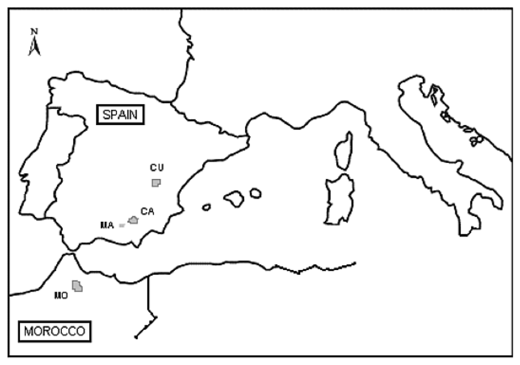 Geographic locations of populations sampled from Spain and Morocco. CU (Cuenca Mountains); CA (Cazorla Mountains); MA (Sierra Mágina); MO (Atlas Range).