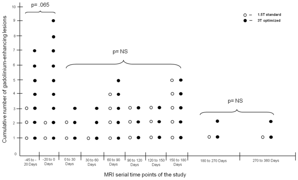 During the 180 and 360 treatment periods of the study, there were no differences in the cumulative number of new Gd-E and T2 lesions using the 3 T optimized and the 1.5 T standard protocol, although there was significantly higher Gd-E lesion activity at Day 0 on the 3 T optimized compared with the 1.5 T standard protocol (p = 0.0006). Compared to the pre-treatment period, at Days 180 and 360, a significantly greater decrease in the cumulative number of Gd-E lesions (p = 0.03 and 0.021, respectively) was found using the 3 T vs. the 1.5 T protocol (p = NS for both time points).