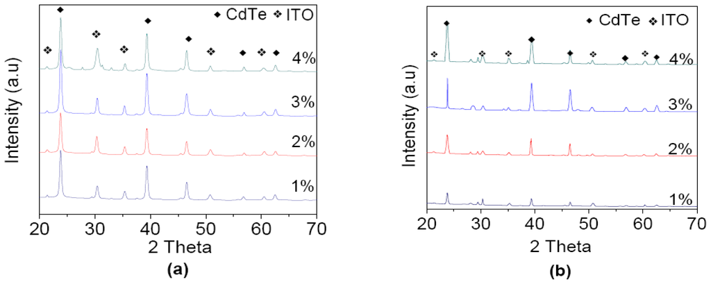 X-ray diffractometer (XRD) patterns of CdTe film at bath temperatures, (a) 30 °C; and (b) 60 °C from 1 to 4 wt% CdTe concentration.