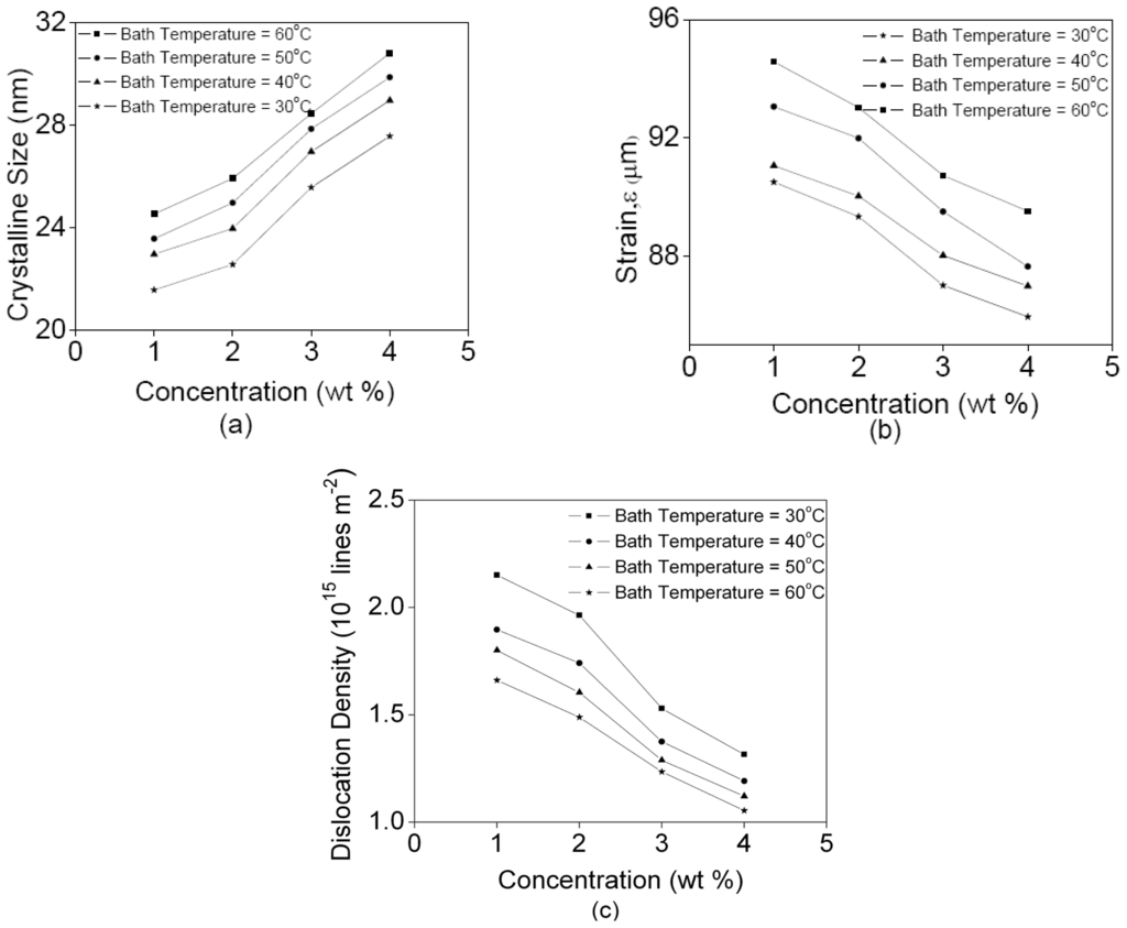 Figure 2 shows the crystallite size, micro-strain, and dislocation density at every bath temperature as a function of CdTe concentration. The maximum and minimum crystallite sizes are 30.805 and 21.562 nm for 4 wt% (bath temperature, 60 °C) and 1 wt% (bath temperature, 30 °C), respectively. With the increasing CdTe concentration the crystallite size increases and the micro-strain decreases. The increase in crystallite size at high bath temperature can be interpreted as due to large surface mobility of the depositing atoms. Hence, there is a decrease in the density of nucleation centers and under these circumstances a smaller number of centers start to grow []. Dislocation density as well as other lattice defects may also increase the crystallite size. As the crystallite size increases the lattice defect decreases leading to a decrease in micro-strain.