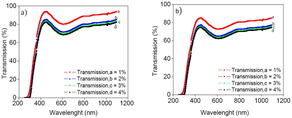 The transmittance spectra of the CdTe films coated onto ITO glass substrate for a CdTe concentration from 1 to 4 wt% and bath temperatures of 30 °C and 60 °C are shown in Figure 3. The transmittance peak increases and the window range shifts towards a lower wavelength with the decrease of CdTe concentration. It can be seen that the transmittance has the maxima of 94% and 84% for 1 wt% concentration at bath temperatures of 30 °C and 60 °C, respectively, and decreases with increasing CdTe concentration.