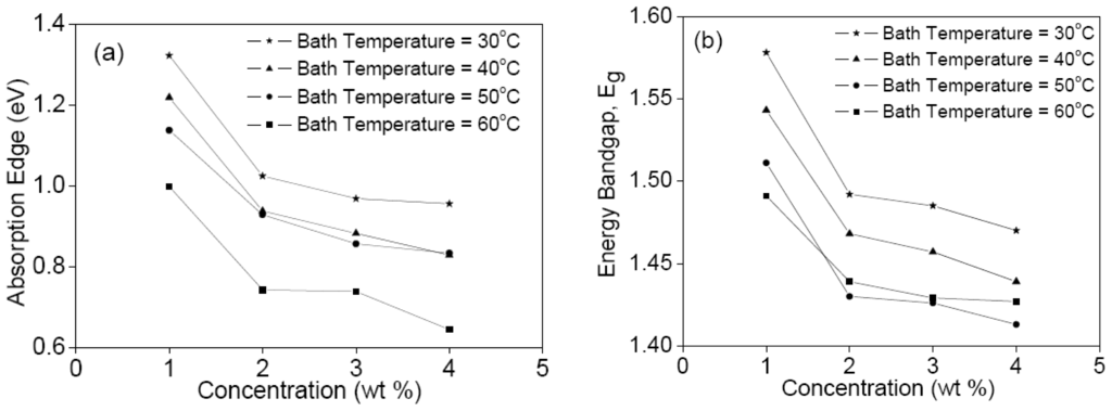 Following from the transmission spectra, we can evaluate the optical energy band gap (Eg) and determine the absorption edge, as can be seen in Figure 4a,b, respectively. Both clearly decrease with the increase of CdTe concentration for each isothermal bath temperature, and also decrease with the increase of isothermal bath temperature, which agrees with previous finding for CdTe thin films []. This decrement was attributed to the increase in film thickness and increase in grain size. As the bath temperature increases, the ad-atom mobility also increases, which results in the increase of crystallite size and crystallinity of the films []. The same thickness of film will be obtained if the deposition time is constant unless the thickness will increase with the increasing of concentration and bath temperature at a constant of deposition time. However, the increase in bath temperature and concentration can cause a non-uniform film.