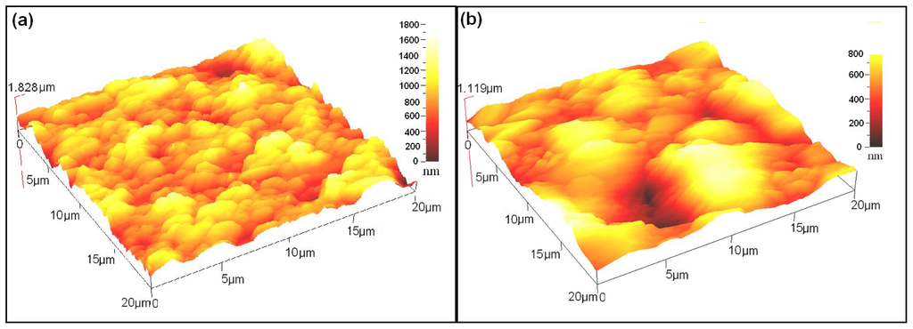 Figure 5a,b display typical AFM micrographs of CdTe films deposited onto ITO glass. The bath temperatures influence the roughness of surface substrate and also the thickness of the films. The films deposited at a bath temperature of 30 °C and at a concentration of 3 wt% have a homogeneously uniform surface and are suitable for solar cell application as their thickness is around 8 μm, Figure 5a. When the bath temperature increases to 60 °C, Figure 5b, it can be seen that the number of grains decreases and grain size increases as a result of increasing of the crystallite size, Figure 2a [].