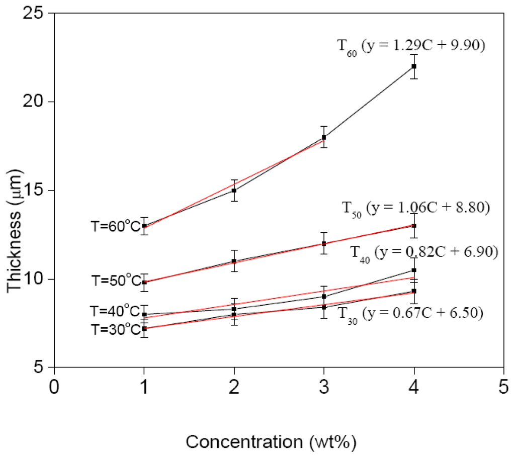 This expression is useful to estimate the appropriate environments, i.e., concentration and bath temperature, to produce CdTe film thickness by EPD technique, in the range of 0 to 25 μm. However for comparison, the thickness value obtained by Ebeid et al. [] using EPD technique at only a single temperature of 150 °C and a CdTe concentration of 1.5 wt% is 47 μm, while from the above expression, if extended to this similar temperature, is 49 μm. The estimated thickness differs only slightly by 2 μm or 4%, which is indeed very small, hence this expression may also be applicable for a reasonably high thickness and bath temperature range.