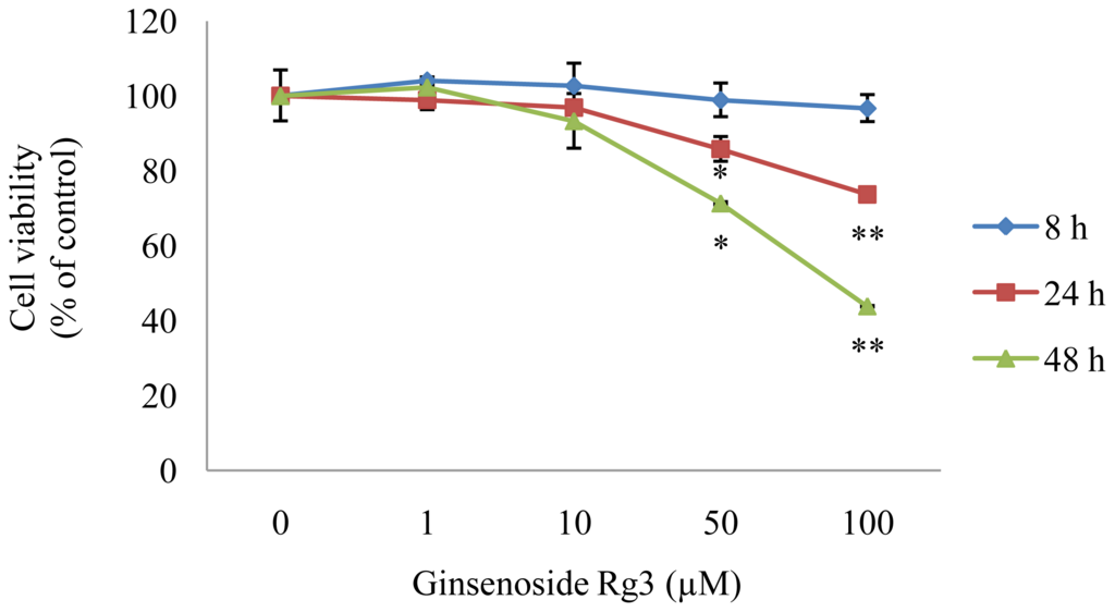 Effect of ginsenoside Rg3 on HepG2 cell viability. Cells were treated with 0 (control), 1, 10, 50, or 100 μM ginsenoside Rg3, and incubated for 8, 24, or 48 h. Cell viability was determined using the WST-8 assay. Values are expressed as mean ± SE (n = 3) of three independent experiments. * P < 0.05 and ** P < 0.01 versus control treatment.