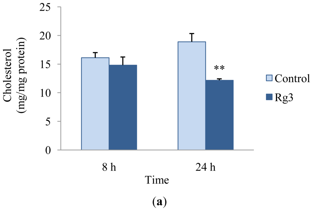 Effects of ginsenoside Rg3 on cholesterol (a) and triglyceride (b) contents in HepG2 cells. Cells were incubated with 10 μM ginsenoside Rg3 for 8 or 24 h. The intracellular cholesterol and triglyceride contents were determined by enzymatic methods. Values are expressed as mean ± SE (n = 3) of three independent experiments. * P < 0.05 and ** P < 0.01 versus control treatment.