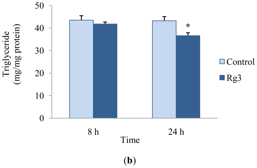 We investigated intracellular cholesterol and triglyceride contents to evaluate the effects of ginsenoside Rg3 on the reduction of cholesterol and triglyceride. HepG2 cells were treated with 10 μM ginsenoside Rg3 for 8 or 24 h. The amount of cholesterol in HepG2 cells in the presence of ginsenoside Rg3 was significantly reduced by 36% in comparison with the control after a 24 h incubation (Figure 2a). The HepG2 intracellular triglyceride content in the presence of ginsenoside Rg3 also decreased by 15% compared with that of HepG2 cells in the absence of ginsenoside Rg3 (Figure 2b). Previous studies reported that treatment with high concentrations of ginsenoside Rg3 (40–100 μM) reduce intracellular triglyceride accumulation in 3T3-L1 adipocytes [4,9]. Hwang et al. suggested that ginsenoside Rg3 is effective in inhibiting lipid biosynthesis by up-regulating AMPK [4]. Treatment with ginsenoside Rg3 results in a decrease in blood cholesterol and triglyceride levels in hyperlipidemic mice [5] and in obese type 2 diabetic rats [18]. Treatment with Korean red ginseng extract, which is enriched with ginsenoside Rg3, reduces the serum total cholesterol level in C57BL/6J mice fed a high-fat diet by down-regulating lipid-metabolism associated genes such as cholesterol 7α-hydroxylase (CYP7A1), which catalyzes the synthesis of cholesterol, steroids, and other lipids [19]. In this study, ginsenoside Rg3 reduced cholesterol and triglyceride accumulation in HepG2 cells.