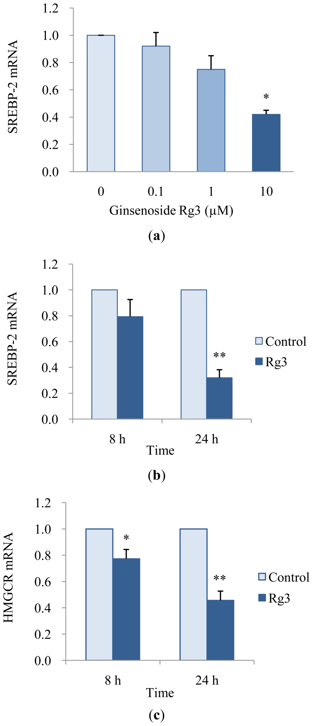 We investigated the mRNA expression of SREBP-2 and HMGCR to understand the mechanism that underlies the hypolipidemic effect of ginsenoside Rg3 in HepG2 cells. Ginsenoside Rg3 decreased mRNA expression of SREBP-2, a major direct transcriptional regulator of genes involved in cholesterol metabolism, in dose- and time-dependent manners (Figure 3a,b). Gene expression of HMGCR, which catalyzes a rate-limiting step in cholesterol synthesis, was also suppressed in a time-dependent manner (Figure 3c). Our results indicate that ginsenoside Rg3 down-regulated SREBP-2 and HMGCR mRNA expression. Consequently, inhibiting cholesterol biosynthesis by down-regulating SREBP-2 and HMGCR mRNA expression may be evidence for the hypothesis that ginsenoside Rg3 has a hypolipidemic effect in HepG2 cells.