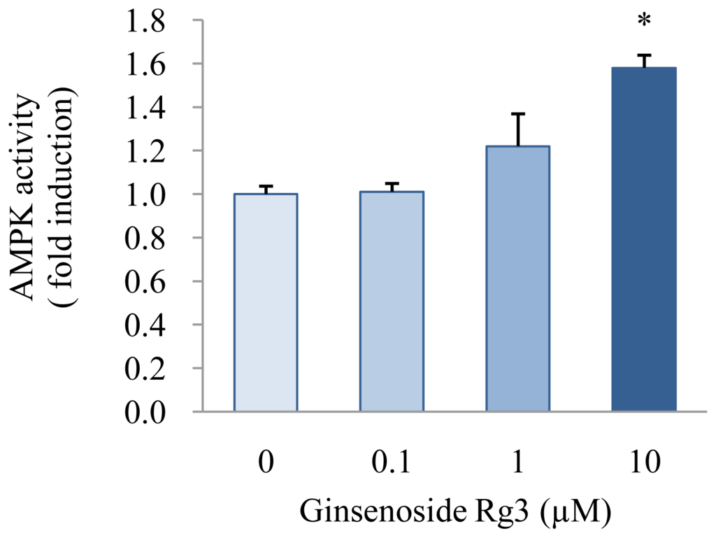 Effect of ginsenoside Rg3 on AMPK activity in HepG2 cells. Cells were treated with various concentrations (0, 0.1, 1, or 10 μM) of ginsenoside Rg3 for 24 h. AMPK activity was determined using an AMPK Kinase Assay Kit. Values are expressed as mean ± SE (n = 3) of three independent experiments. * P < 0.05 versus control treatment.