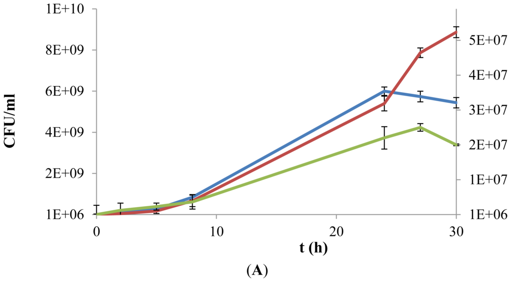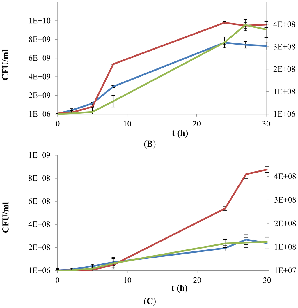 Growth kinetics of L. plantarum WCFS1 (A), L. plantarum WCFS1β-gal (B) and L. acidophilus (C) in a chemically defined medium supplemented with d-glucose (10 g L−1) (blue line), exopolysaccharides (EPS) (0.5% w/v) (green line) or both (red line). Values of growth in presence of only EPS are reported on a secondary Y-axis. Growth was monitored over a 30 h period, by colony forming units (cfu) counting.