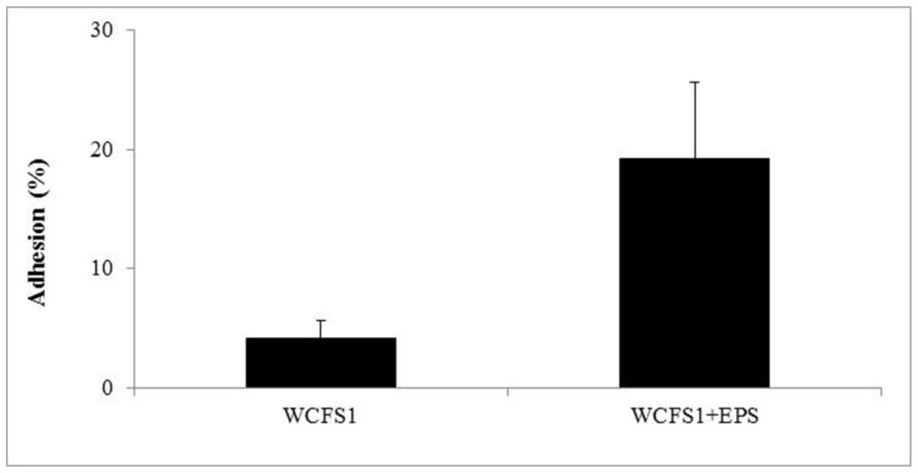 Percentage of adhesion of L. plantarum WCFS1 to Caco-2 cells after incubation with, or without EPS (0.5% w/v).