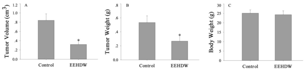 The anti-tumor effect of EEHDW in vivo was evaluated by measuring tumor volume and weight in CRC xenograft mice, while its adverse effect was determined by measuring the body weight gain. As shown in Figures 2A,B, administration of EEHDW decreased tumor volume and weight by 52% and 45%, respectively, compared with control. However, EEHDW treatment had no effect on the body weight gain in experimental animals (Figure 2C). These data suggest that EEHDW can inhibit colorectal tumor growth in vivo, without apparent signs of toxicity.