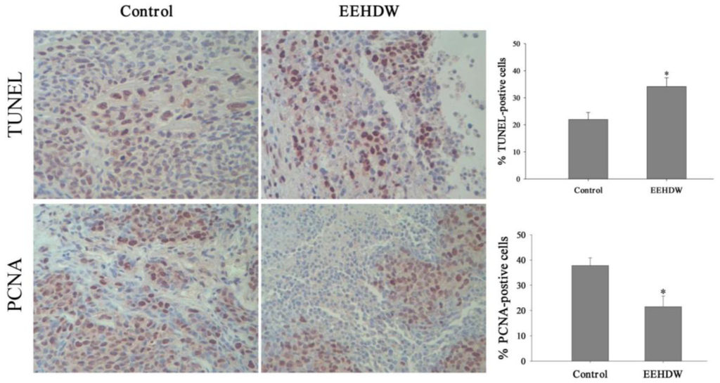 The in vivo effect of EEHDW on cell apoptosis and proliferation was determined by immunohistochemical (IHC) staining for TUNEL and PCNA. Data in Figure 3 showed 22.0 ± 2.59% and 34.2 ± 3.19% TUNEL-positive cells in control and EEHDW-treated mouse groups, and the percentage of PCNA-positive cells in control and EEHDW-treated mice was 37.8 ± 3.08% and 21.5 ± 4.22%, respectively. Taken together, it is demonstrated that EEHDW inhibits the proliferation of colorectal cancer cells and promotes cell apoptosis in vivo.
