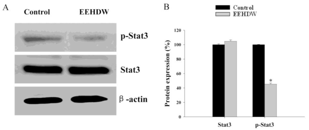 The activation of STAT3 is mediated by phosphorylation at tyrosine residue 705. We therefore examined the effect of EEHDW on STAT3 phosphoralytion in tumor tissue by Western blot analysis using antibody that recognizes STAT3 phosphorylation at Tyr705. As shown in Figure 4, EEHDW inhibited the phosphorylation of STAT3 in CRC mice, whereas the level of non-phosphorylated STAT3 remained unchanged after EEHDW treatment, suggesting that EEHDW significantly suppresses the activation of STAT3 in vivo.