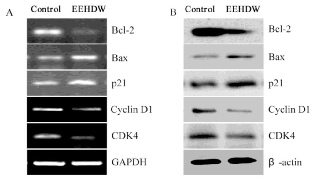 3.4. EEHDW Regulates the Expression of Bcl-2, Bax, p21, Cyclin D1 and CDK4 in CRC Xenograft Mice