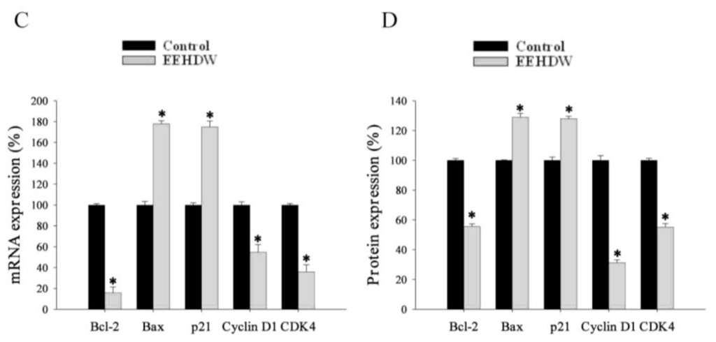 To further explore the mechanism of EEHDW’s pro-apoptotic and anti-proliferative activities, we performed RT-PCR and Western Blot analyses to examine the mRNA and protein expression, respectively, of the pro-proliferative Cyclin D1, CDK4, anti-proliferative p21 and the pro-apoptotic Bax, anti-apoptotic Bcl-2. The results of the RT-PCR assay showed that EEHDW treatment profoundly reduced the mRNA expression of Bcl-2, p21, Cyclin D1, CDK4 but increased that of Bax and p21 in CRC mice (Figures 5A and C). Data from Western blot analysis showed that the pattern of protein expression was similar to the respective mRNA levels (Figures 5 B,D).