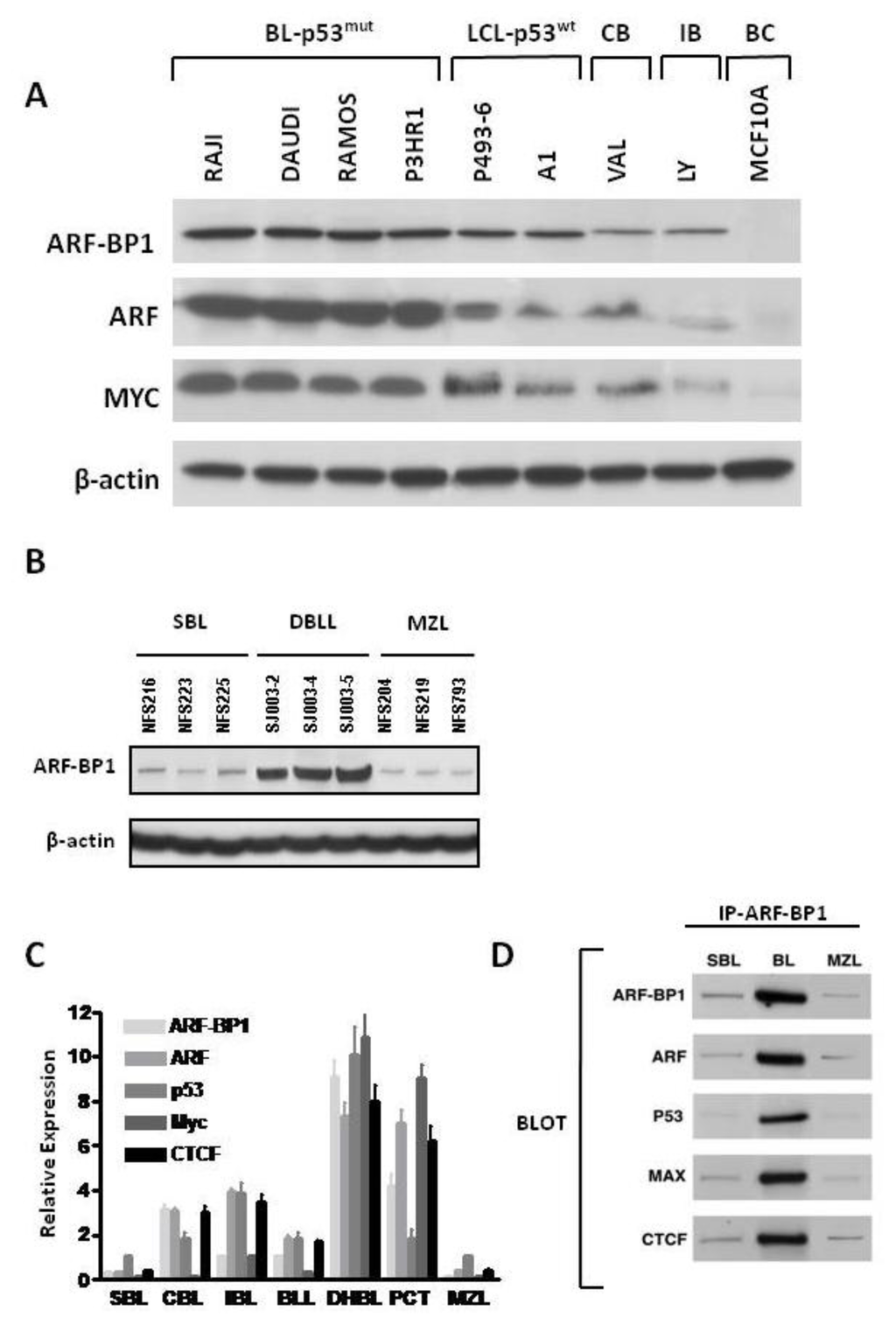 (A) Western blot analyses of ARF-BP1, ARF, and MYC in human Burkitt lymphoma (BL), EBV-transformed lymphoblastoid cells (LCL) and diffuse large B cell lymphomas (DLBCL). Mutational status of p53 in BL and LCL is indicated. MCF10A is a non-tumorigenic epithelial cell line as a negative control of ARF-BP1; (B) Western blot analyses of ARF-BP1 expressions in small B cell lymphomas (SBL-NFS216, NFS223 and NFS225), splenic marginal zone lymphomas (MZL-NFS204, NFS219 and NFS793) and λ-MYC diffuse high grade B cell lymphoblastic lymphomas (DBLL-SJ003-2, SJ003-4, and SJ003-5) from NFS.V+ mice; (C) qRT-PCR analyses of transcript levels for ARF-BP1, ARF, p53, MYC, and CTCF in cell lines derived from different classes of B cell lineage neoplasms; (D) Western blot analyses of cell lysates from SBL, λ-MYC TG DBLL and MZL-derived cell lines immunoprecipitated with ARF-BP1 antibody and blotted with antibodies to ARF-BP1, ARF, p53, MYC and CTCF.