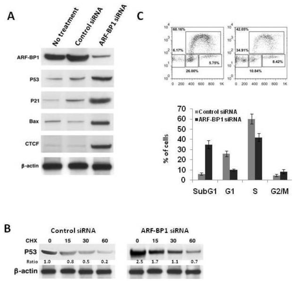 The changes in expression of p53, p21 BAX and CTCF induced by siRNA to ARF-BP1 were reflected by changes in cell cycle regulation and apoptosis. As shown in Figure 3C, cells treated with the ARF-BP1-specific siRNA had reduced frequencies of cells in cycle and had greatly increased numbers of sub-G1 cells, indicative of an apoptotic population.
