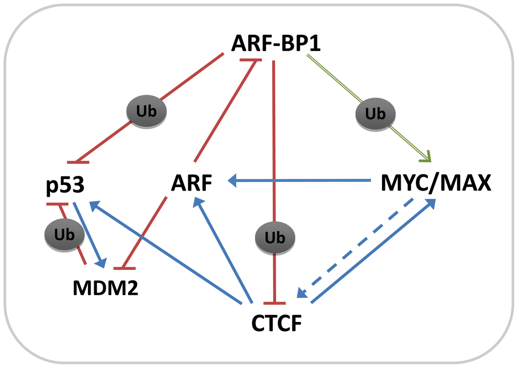The functions of the p53 tumor suppressor protein and the MYC oncogene are finely tuned through a myriad of interactions with other proteins. These interactions can lead to posttranslational modifications that regulate protein stability, DNA binding or promoter-specific transcriptional activation or repression [,,]. It is currently well accepted that ubiquitylation plays a major part in regulating the activities of both p53 and MYC and that this reflects the activities of a seemingly ever increasing number of different E3 ligases [,]. ARF-BP1 is unique among these E3 ligases in that it targets both p53 and MYC with profound effects on the development and growth of a variety of MYC-driven solid tumors [].