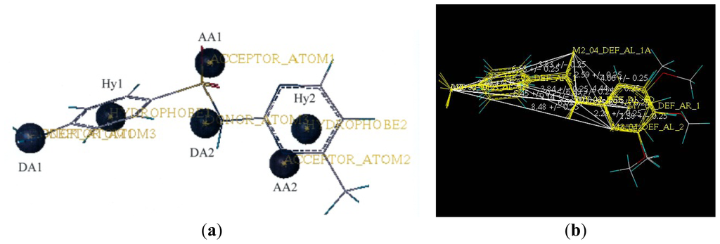 A stereoscopic view of the sulfonamide pharmacophore model derived from DISCOtech. (a) A stick frame representation of six sulfonamides is shown in their overlapping conformations; and (b) six pharmacophore feature points are shown, i.e., two hydrophobic center sites (Hy1 and Hy2), two hydrogen-bond acceptor atom sites (AA1 and AA2), and two hydrogen-bond donor atom sites (DA1 and DA2).