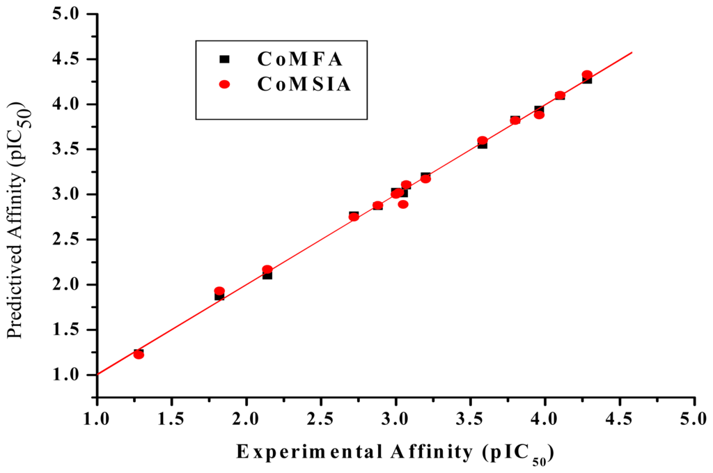 Plot of experimental versus predicted affinity values derived from the CoMFA and CoMSIA models.
