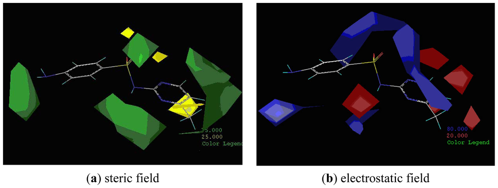 CoMFA contour plots of (a) steric field and (b) electrostatic field contributions of sulfonamides binding the MAbSMR.