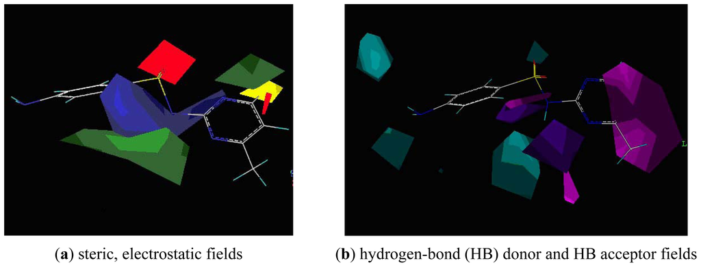 Figure 6b shows the contribution of the HB donor and HB acceptor regions of the best model derived by CoMSIA. The CoMSIA HB donor contour map shown with cyan contours near the nitrogen atom at position 17 and the oxygen atom at position 8 will be favorable for binding affinity, while the purple isopleths near the sulfonamido group at positions 7, 8, 9 and 10 suggest that a HB acceptor R-group is unfavorable for binding affinity. Magenta isopleths are mainly concentrated on the heterocyclic ring where a HB acceptor group in the sulfonamide analogs would enhance binding affinity. This is in agreement with the CoMSIA electrostatic field model, showing that an electron-rich atom acts as a HB acceptor, which explains why the compounds with a nitrogen, oxygen or sulfur atom at position 3 in the heterocyclic ring exhibit better binding than those without an electron-rich atom at this position.