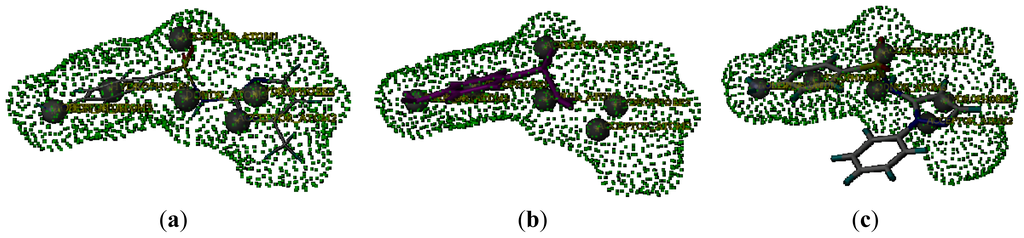 Connolly surface of (a) sulfamerazine expressed by the green dotted area. The optimized conformations of (b) sulfanilamide; and (c) sulfaphenazole were superimposed onto the sulfamerazine Connolly surface.