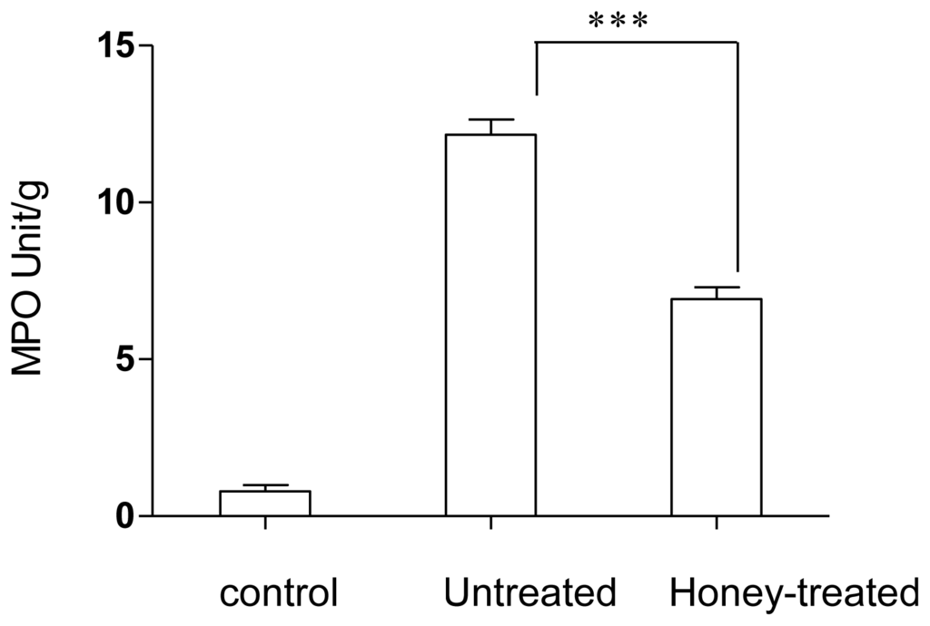 2.1. Effect of Gelam Honey on Biochemical and Hematological Tests, Histopathology, and MPO Activity
