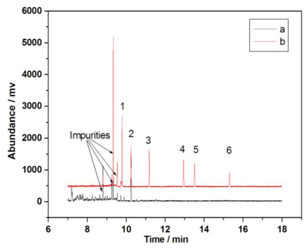 2.6. Comparison of MWCNTs-COO-/PDDA@Fe3O4-SPE with Other Extraction Methods of PCBs