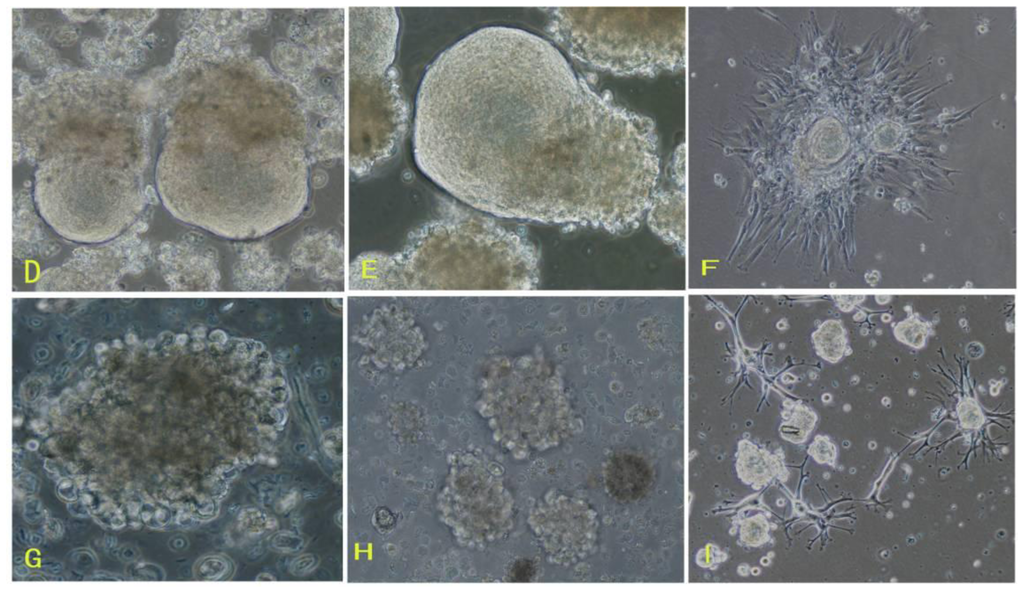Subsequently, cells were seeded at a concentration of 5 × 105/mL. The basic culture medium was a neural stem cell medium established previously for culturing neurospheres. We added 20 nM progesterone, 100 mM androstenedione in a basic culture medium, because most kinds of meningioma express receptors for progesterone and androstenedione. Cells were cultured in a 3% O2, 5% CO2 atmosphere. The next day, cells began to gather into small spheres. Half of the old medium was replaced with fresh medium every 3 days. We named this medium a conditional medium, which consisted of half of the old culture medium and half of the fresh medium. Under the conditions described above, we established primary cultures from three meningioma subtypes (Table 1, Figure 1 A,D,G).