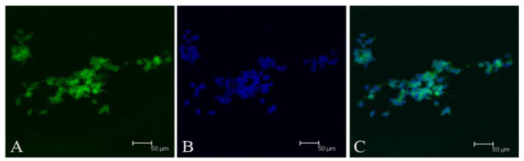 Expression of CD133 of meningioma cells. (A) CD133; (B) Hochest33342; and (C) merged. Scale bar = 50 μm.