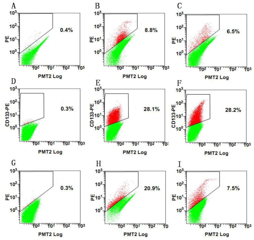 Percentage of CD133-positive cells at the third generation from different subtypes of meningioma cells. (A–C) Meningioma cells from fiber meningiomas (A: control, B: 1# patient, C: 2# paitent); (D–F) Meningioma cells from epithelial meningiomas (D: control, E: 5# patient, F: 6# paitent); (G–I) Meningioma cells from Hemangiopericytomas (G: control, H: 3# patient, I: 4# patient).