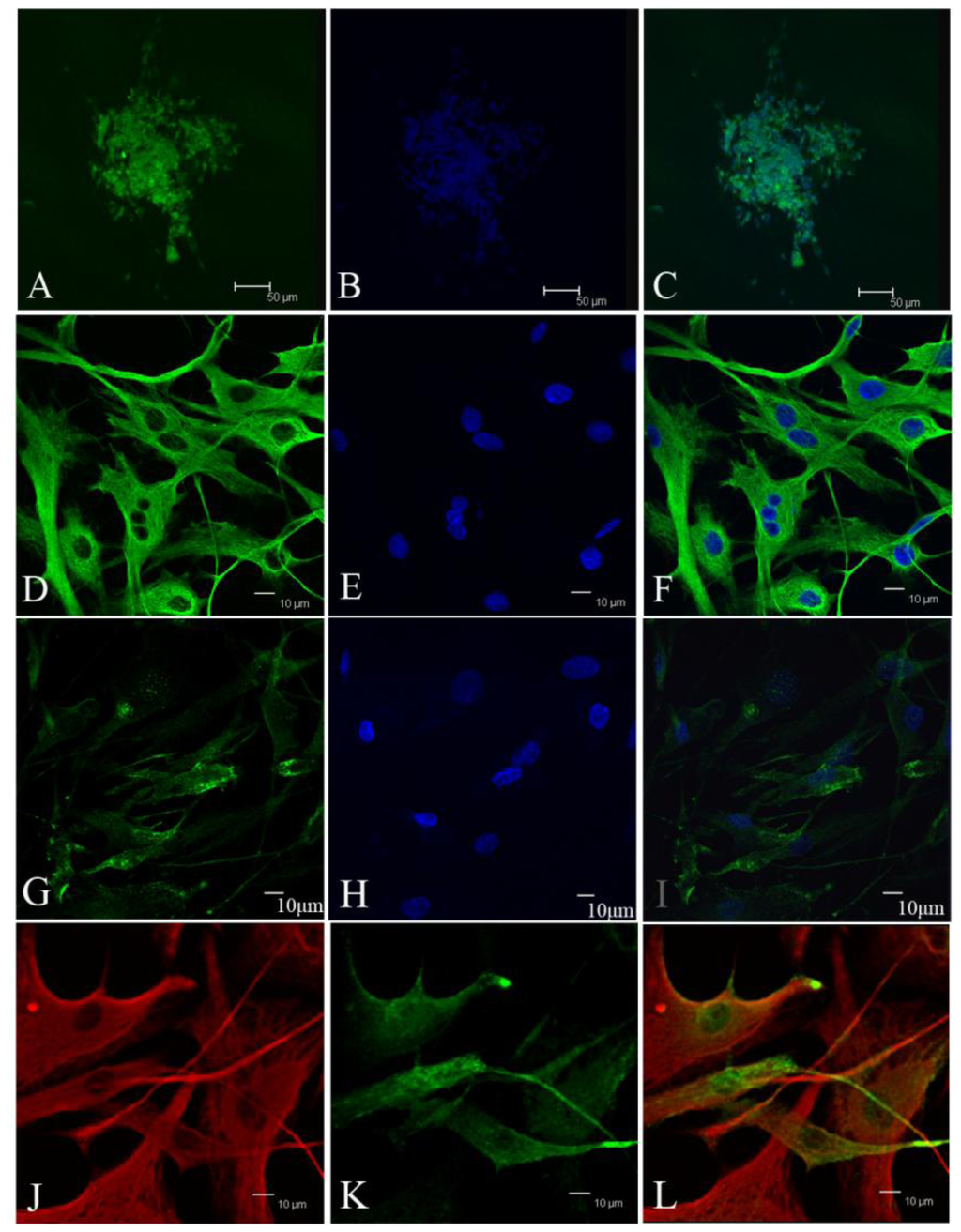 Characterization of meningioma cells. (A–C) EMA (A: EMA, B: hochest33342, C: merged, Scale bar = 50 μm); (D–F) vimentin (D: vimentin, E: hochest33342, F: merged); (G–I) Desmoplakin (G: Desmoplakin, H: hochest33342, I: merged). Scale bar = 10 μm. (J–L) double-labeling VEGF and vimentin (J: vimentin, K: VEGF, L: merged), Scale bar = 10 μm.