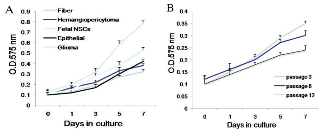 To evaluate the proliferative capacity of the tumor cells, we compared cell proliferation features of different subtypes of tissue-derived cells, the same tissue-derived cells in different culture status, and the same tissue-derived cells in different generations. Cells were plated at 1000 cells/well, and the number of viable cells was quantified on days 0, 1, 3, 5, and 7 after plating. For different subtypes of tissue-derived cells, all of the tumor sphere cell populations assayed demonstrated increased proliferative capacity, but showed a slower degree of cell proliferation than that of human glioma and fetal NSCs (Figure 7A). For the same tissue-derived cells in different culture status, cells in spheres showed a rapid proliferation, compared with cells in adherence (Figure 7B). For the same tissue-derived cells in different generations, we found that the proliferation rate slowed down with the increase of cell generations (Figure 7C).