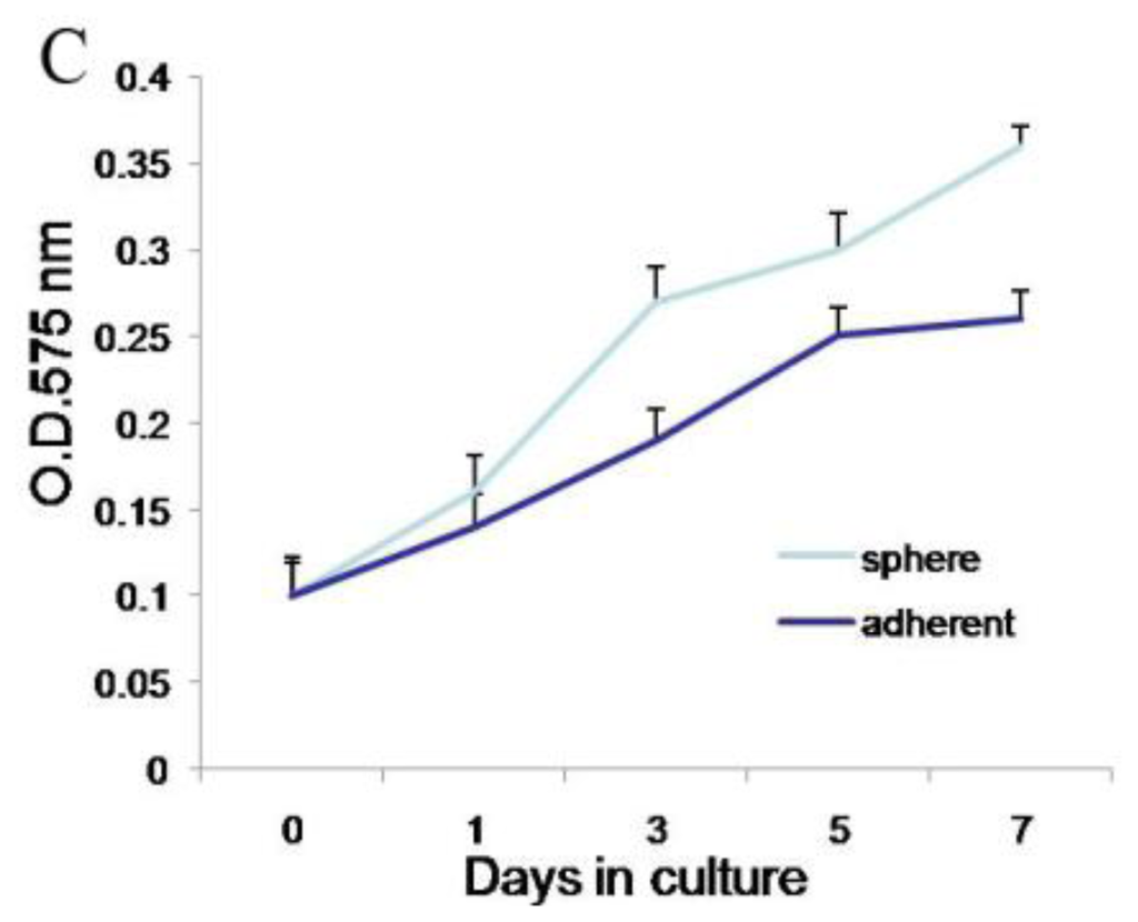 Cells were seeded at a concentration of 5 × 105/mL into substrate-free tissue culture flasks and culture in a 3% O2, 5% CO2 atmosphere. The growth medium consisted of DMEM/F12 (phenol red-free) containing 50 units/mL penicillin–streptomycin, B27 (1:50), human recombinant FGF-2 and EGF (both at 20 ng/mL), 20 nM progesterone, 100 mM androstenedione and heparin (5 μg/mL).