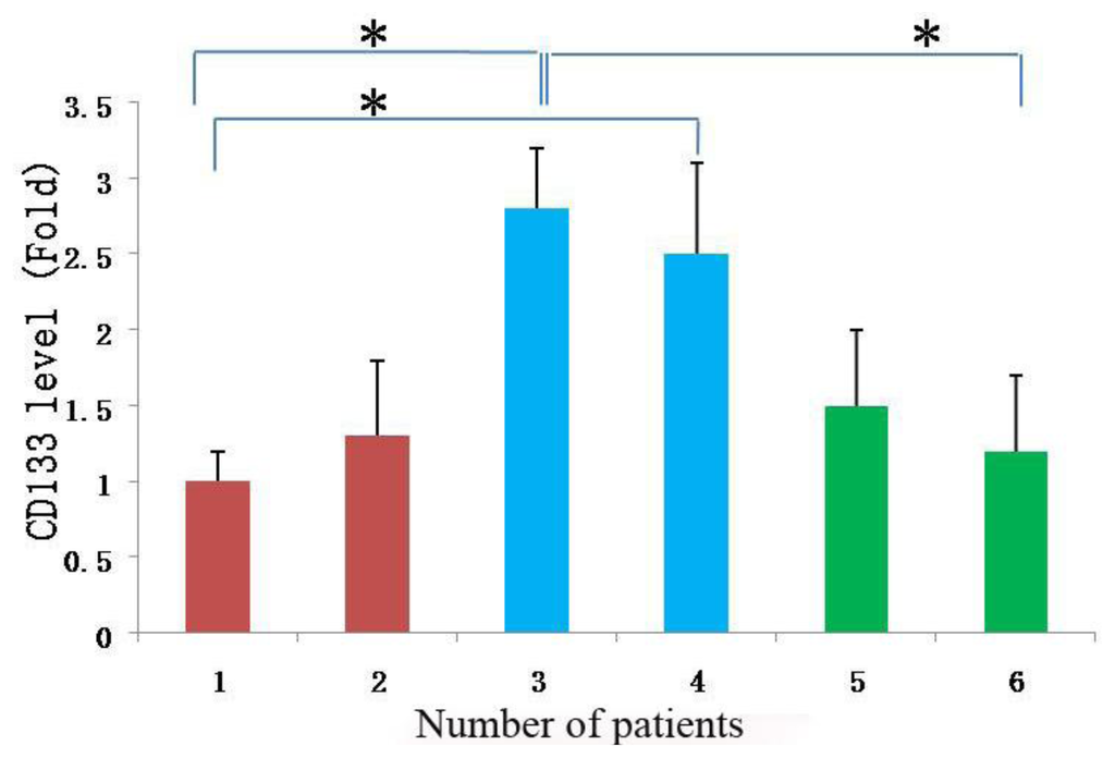 CD133 expression in meningioma cells from different subtypes of tissue. 1 and 2 (red): cells from fiber meningioma tissues; 3 and 4 (blue): cells from epithelial meningioma tissues; 5 and 6 (green): cells from hemangiopericytoma meningioma tissues. * p < 0.05.