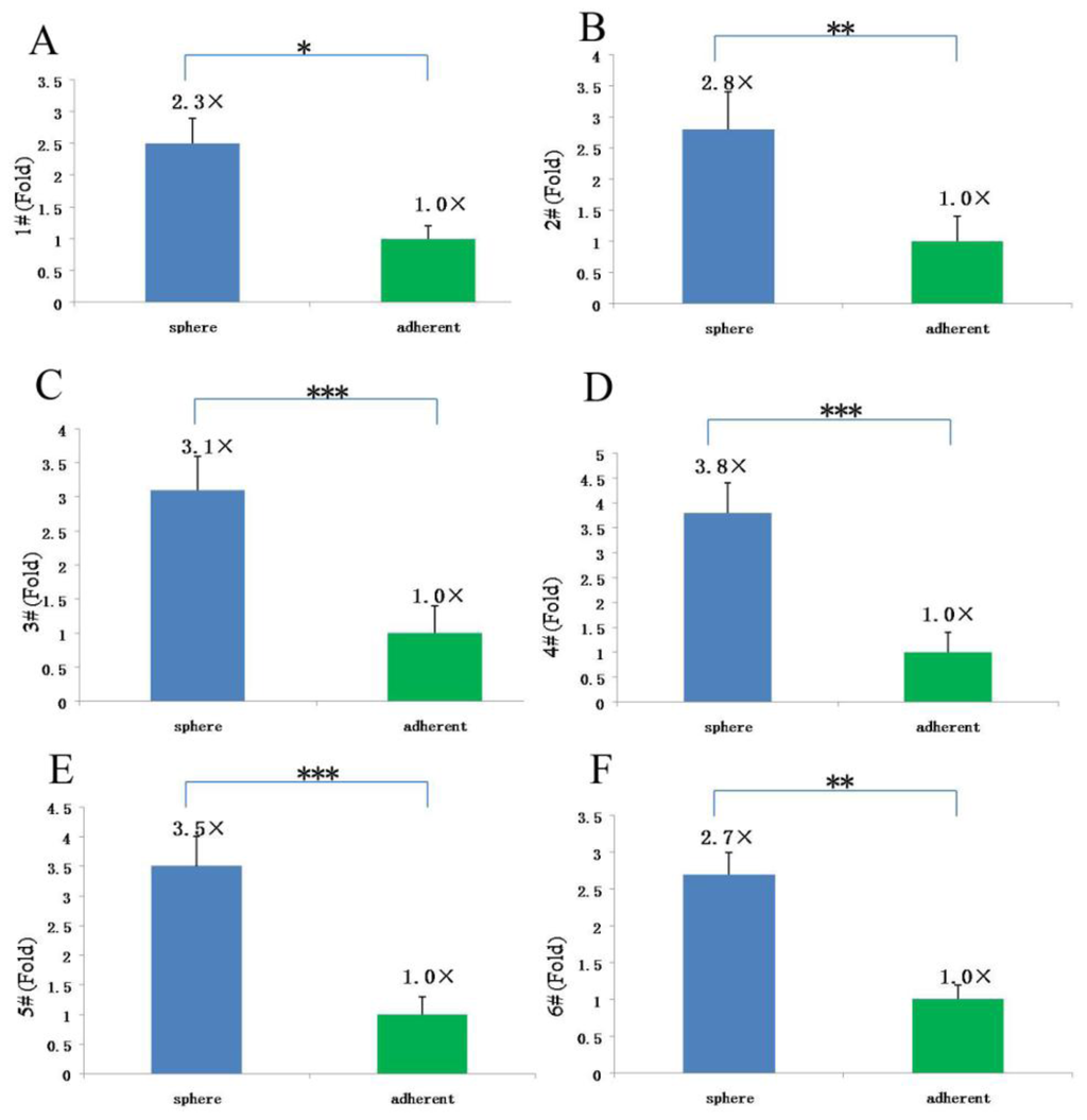 CD133 expression in the same subtypes of tissue-derived meningioma cells under different culture status. Blue: suspended sphere culture; green: adherent culture. * p < 0.05; ** p < 0.01; *** p < 0.001.