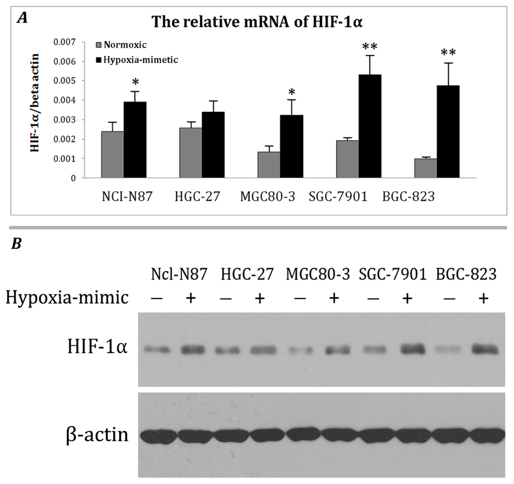 Identification of hypoxia mimetic chemical sensitive gastric cancer cell line. (A) Different cell lines were treated with 100 μM cobalt chloride and real-time PCR was performed to analyze the mRNA levels of HIF1α. The columns represent the gene expression of HIF1α compared to beta-actin, compared to the corresponding normal one. * p < 0.05 and ** p < 0.01; (B) Different cell lines were treated with 100 μM cobalt chloride for 24 hours and cell lysates were subjected to western blotting. β-actin served as the loading control. The results shown are representative of three independent experiments.