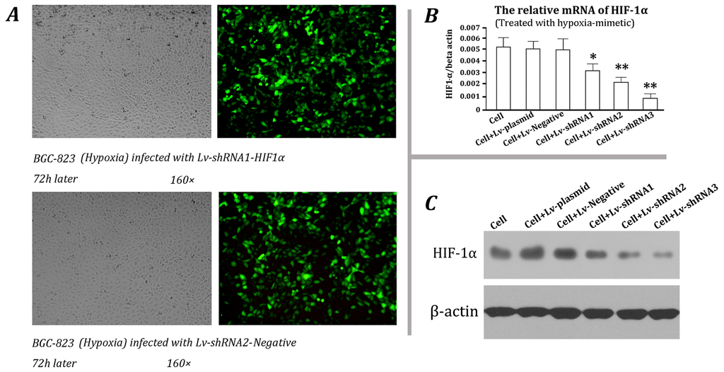 Selection of effective shRNA targeting HIF-1α. (A) BGC-823 cells were infected with (1) Lv-shRNA1-HIF1α and (2) Lv-shRNA1-Negative lentivirus, respectively, and the infection efficiency after 72 h was detected by microfluorography; (B) Total RNA was extracted from the infected cells or control cells which were treated with 100 μM cobalt chloride for 24 h and analyzed by real-time PCR. The expression of HIF1α mRNA was normalized by β-actin mRNA. * p < 0.05, ** p < 0.01 compared to the control; (C) Total proteins were extracted from the infected cells or control cells which were treated with 100 μM cobalt chloride for 24 h and analyzed by western blotting. β-actin served as the loading control. The results shown are representative of three independent experiments.