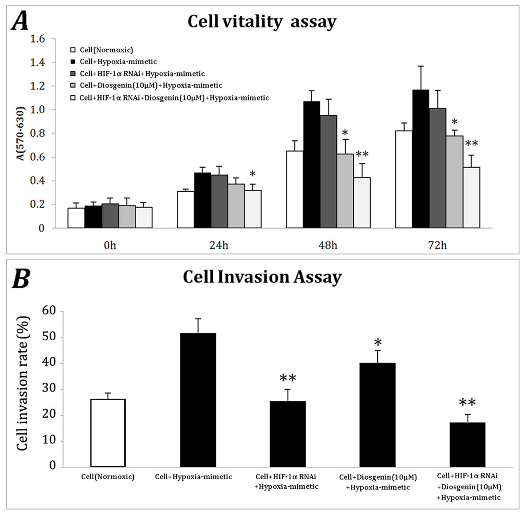 In conclusion, we identified a hypoxia-mimic sensitive gastric cancer cell line BGC-823 and found that cobalt chloride can promote its ability to invade and survive. By knockdown of HIF-1α via lentiviral delivery of specific HIF-1α shRNA, the enhanced status of invasion and survival is effectively decreased. In addition, diosgenin, as a candidate contributing to new therapy approaches, is also explored since it can significantly inhibit the cobalt chloride induced invasion and survival in BCG823, especially when combined with down-regulation of HIF-1α. Subsequent studies should focus on whether diosgenin, when combined with shRNA of HIF-1α, is effectively applied to the animal gastric cancer model.