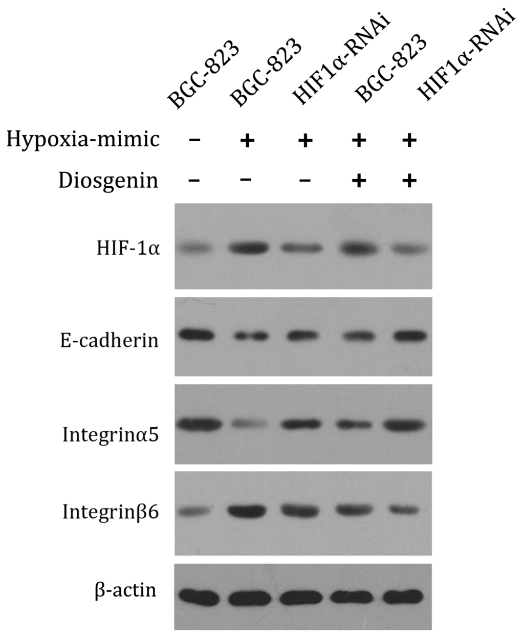 Western blot analysis of HIF1α, E-cadherin, integrinα5 and integrinβ6 protein expression in BGC-823 cells. Normal BGC-823 cells and HIF1α-knockdown BGC-823 cells were treated with or without 100 μM cobalt chloride, with or without 10 μM diosgenin and the total proteins were extracted and subjected to western blotting. β-actin served as the loading control. The results shown are representative of three independent experiments.