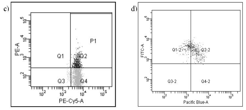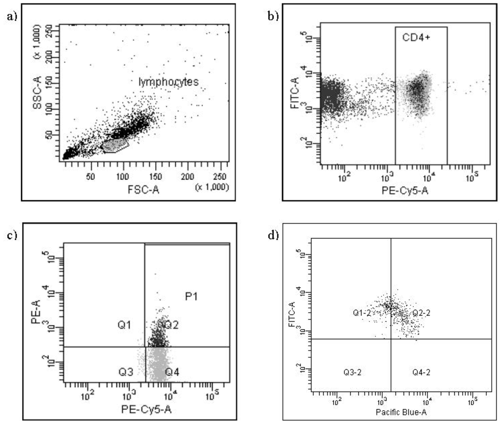 Flow cytometry analysis of the Bcl-2 antigen expression in CD4+CD25+FoxP3+ cells. FITC—anti-Bcl-2, PE—anti-CD25, PE-Cy5—anti-CD4, Pacific Blue—anti-FoxP3. (a) gating of lymphocytes; (b) gating of CD4+ cells; (c) gating of CD4+CD25+ cells; (d) analysis of Bcl-2+CD4+CD25+FoxP3+ (Q2-2) and Bcl-2+CD4+CD25+FoxP3− (Q1-2).