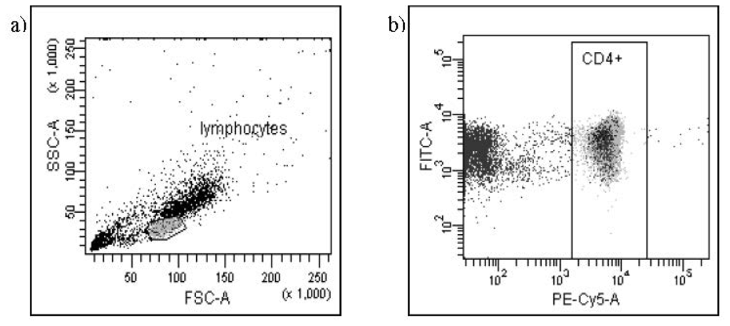 Peripheral blood mononuclear cells (PBMCs) were separated by gradient centrifugation on the lymphocyte separation medium, Lymphoprep (Nycomed, Torshov, Norway). They were centrifuged for 30 min at 600× g at 4 °C, collected from the interface with a Pasteur pipette and washed twice by centrifugation for 5 min at 250 g at 4 °C in 2 mL of the buffer containing phosphate-buffered saline (PBS; Serum and Vaccine Factory, Biomed, Lublin, Poland) with 2% FCS (Fetal Calf Serum, GibcoBRL, Paisley, UK) and the total numbers of cells were determined using the microscope.