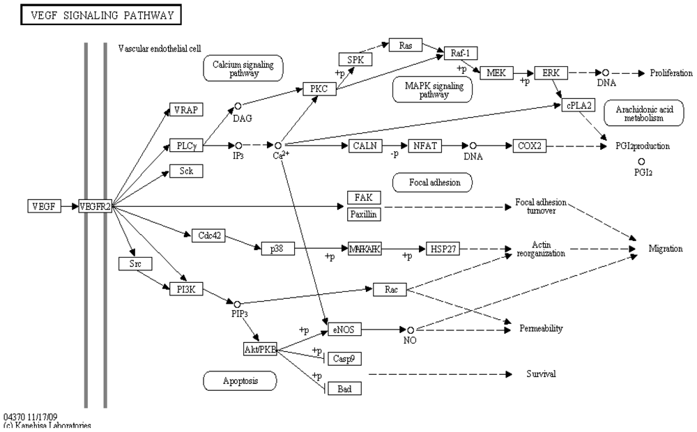 A map of the VEGF signaling pathway (as an example of an important target in cancer therapy) obtained from KEGG is shown [41]. The gene expression studies are used as an independent predictive method for the prognosis. In cancer genomics studies, tremendous effort has been devoted to pathway-based analysis. Pathway analysis is a promising tool to identify the mechanisms that underlie disease, the adaptive physiological compensatory responses and new avenues for investigation. Different pathways have different biological functions. Thus, studying each pathway separately is reasonable. Among the many pathways, only a few have been shown to have predictive power for the development of cancer. In this sense, KEGG could be a useful tool to identify genetic signatures [52].