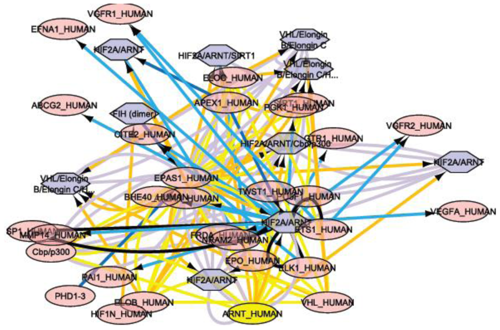 Cytoscape is an open-source bioinformatics software platform for visualizing molecular interaction networks and integrating these networks with other state data. Cytoscape was used to model the interaction networks for VEGF-A (also called vascular permeability factor (VPF). The software found 56 interaction networks at a pathway level, and one of these interaction networks, the HIF-2-α network, is shown with 40 nodes and 114 edges. The importance of this figure is to provide the reader understanding of the level of complexity to which we refer when we speak of interactions at the gene or protein level illustrating this by VEGF-A pathway. Each node represents a molecule that interacts with HIF-2-α; in this case 40 molecules interact with this important marker in different malignancies, through 114 edges.